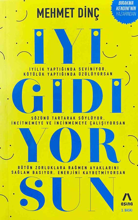 Dostum, kardeşim; Bir şekilde yaşamaktan ziyade doğru bir şekilde yaşamak derdini taşıyorsan, iyi gidiyorsun. Yaptıklarını gözden getiriyor, yapamadıklarını telafi ediyor, yapmak istediklerini değerlerine göre belirliyorsan iyi gidiyorsun. İyilik yaptığında seviniyor, kötülük yaptığında üzülüyorsan iyi gidiyorsun. Sözünü tartarak söylüyor, incitmemeye ve incinmemeye çalışıyorsan iyi gidiyorsun. Heyecanlarını soldurmamaya, göğsünü daraltmamaya, ümitlerini köreltmemeye gayret ediyorsan iyi gidiyorsun. Karşılaştığın bütün zorluklara rağmen ayaklarını sağlam basıyor, yüzünü aydınlık tutuyor, enerjini kaybetmiyorsan iyi gidiyorsun. "İyi Gidiyorsun" güzel hissetmek, farketmek isteyen herkes için, gündelik hayat koşuşturması içerisinde basit görünen ama derinden derine bizi etkileyen önemli konulara değiniyor.